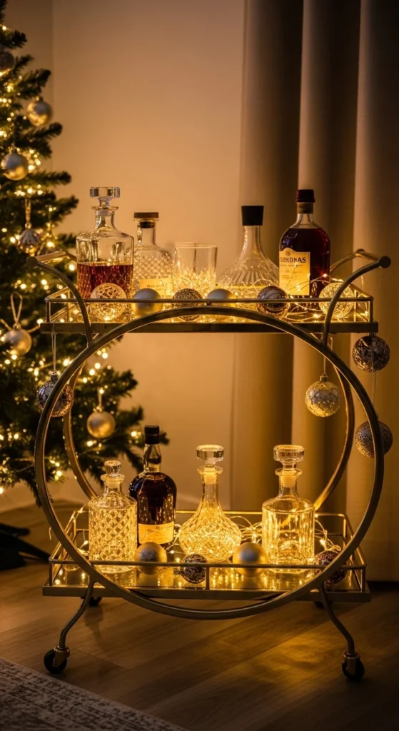 Set the tone with a gold bar cart that doubles as decor. Use gold-trimmed glassware, a few candles, and metallic ornaments to bring instant glam. Add a tray with signature cocktails like cranberry mimosas or spiced rum punch. If you’re tight on space, even a small side table works. Keep it simple but polished — your guests will love helping themselves to drinks.