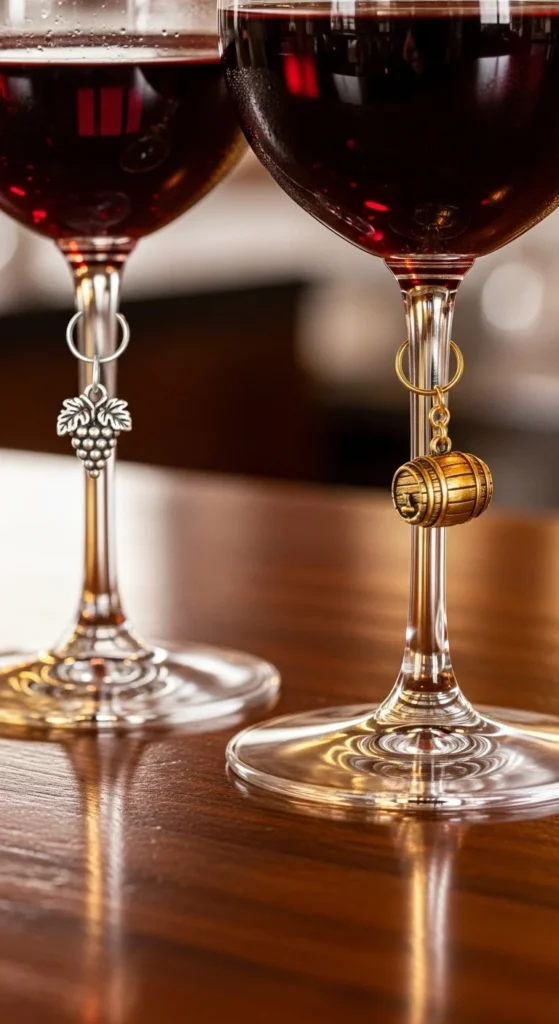 DIY glass charms using tiny bells or colored ribbons. It helps guests keep track of their drinks and adds a cute touch to the table.