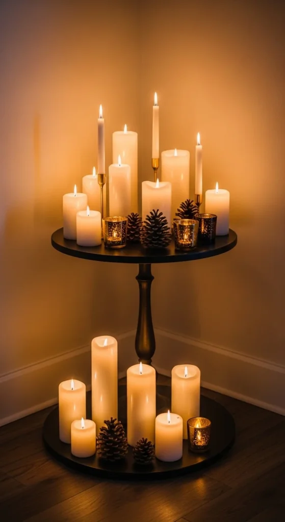 Fill the room with warmth using clusters of candles instead of harsh overhead lights. Mix pillar candles and tea lights in gold holders or mason jars. The soft flicker adds charm instantly and costs less than fancy decor.