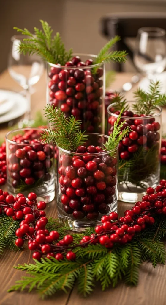 Use cranberries as your signature accent. Float them in glasses of water with tea lights or use them as garlands on your mantel. They’re inexpensive, bright, and perfectly festive for any setting.