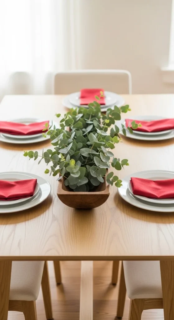 Keep it simple and chic with white plates, linen napkins, and a touch of greenery. No need for expensive centerpieces — a few sprigs of pine and candles do the job beautifully.