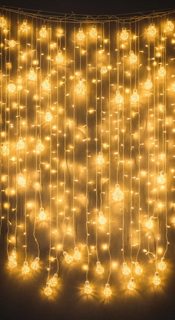 Turn a plain wall into a photo backdrop using fairy lights. Hang them vertically or in a curtain style. Add a “Merry Christmas” banner and let guests take photos all night long.