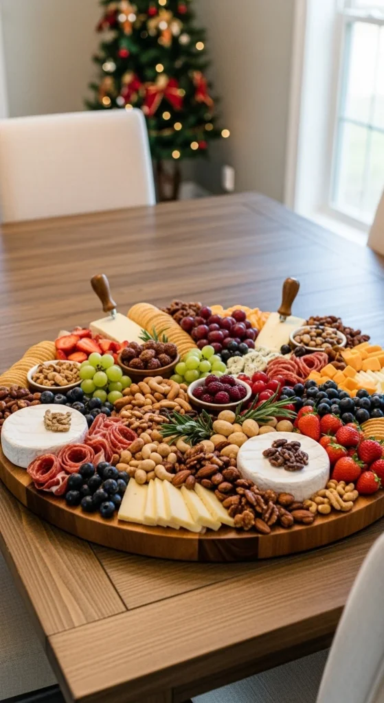 Serve a Christmas grazing board full of cheeses, nuts, berries, and chocolates. It looks fancy but is easy to assemble. Add sprigs of rosemary for a festive scent and presentation.