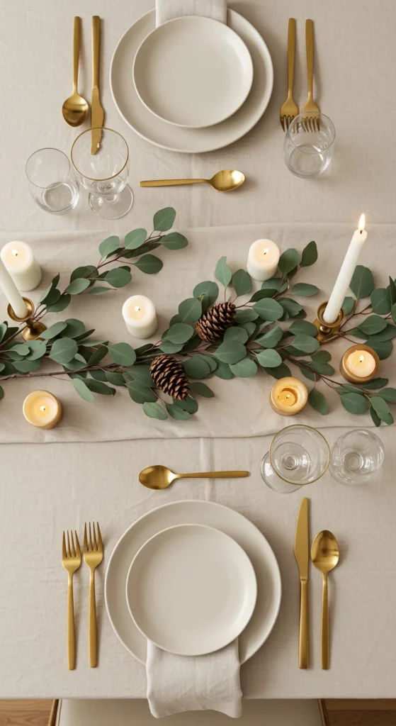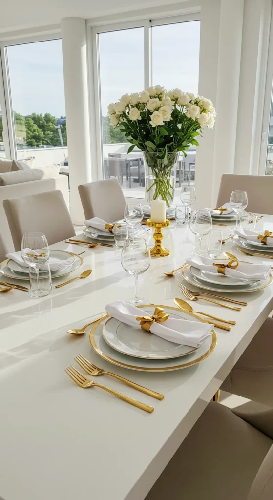 White and gold create timeless elegance. Use a simple white tablecloth, gold-trimmed plates, and metallic flatware. Add gold-painted pinecones or ornaments as centerpieces. You don’t need expensive decor—spray paint inexpensive items gold for an upscale look. The result feels luxurious but stays easy to create at home.