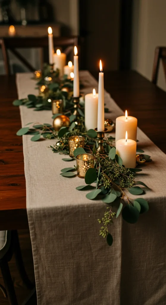 A simple table runner ties the whole setup together. Choose linen or burlap for texture. Add candles or small pine branches along its length for a soft, elegant effect.