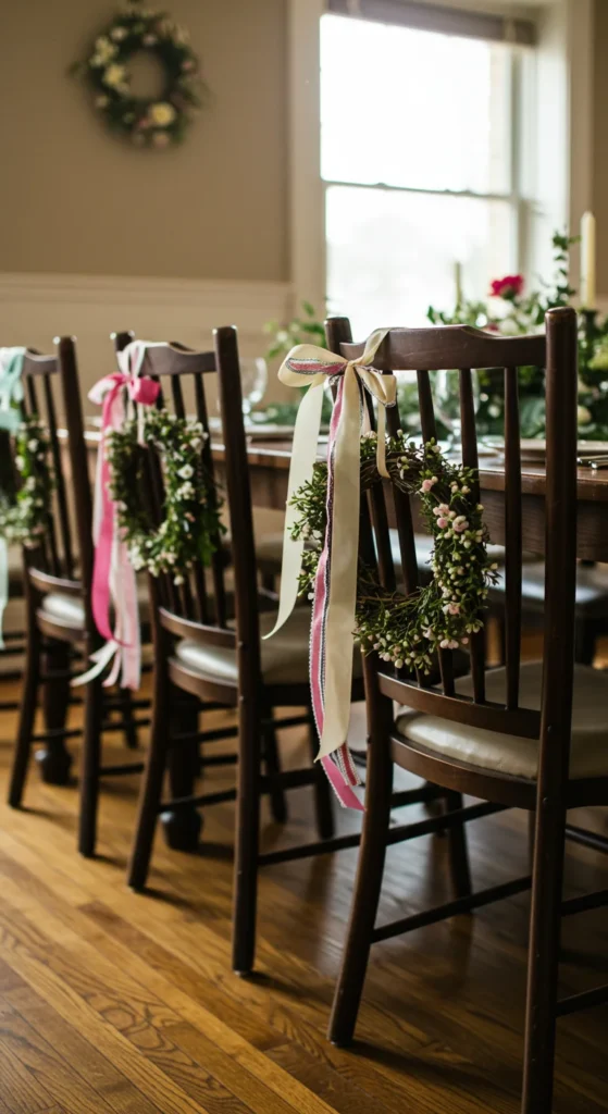 Add a festive touch by tying ribbons or hanging mini wreaths on the back of each chair. It’s low-cost but instantly makes your dining area feel styled.