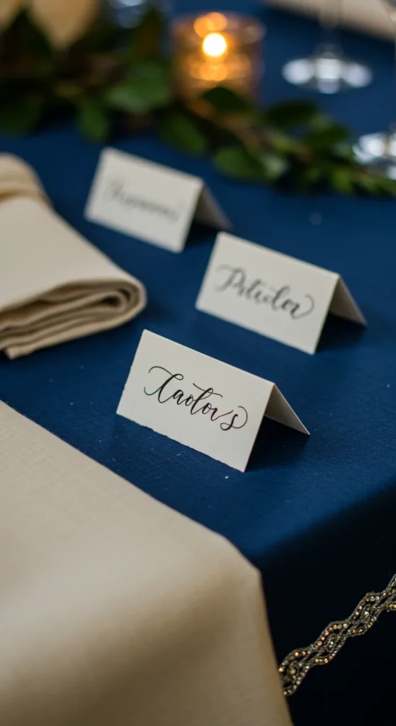 Handwritten place cards add a personal touch that guests appreciate. Write each guest’s name on thick paper or cut small branches of pine to hold the cards. It’s a small detail that makes every seat feel special and organized.
