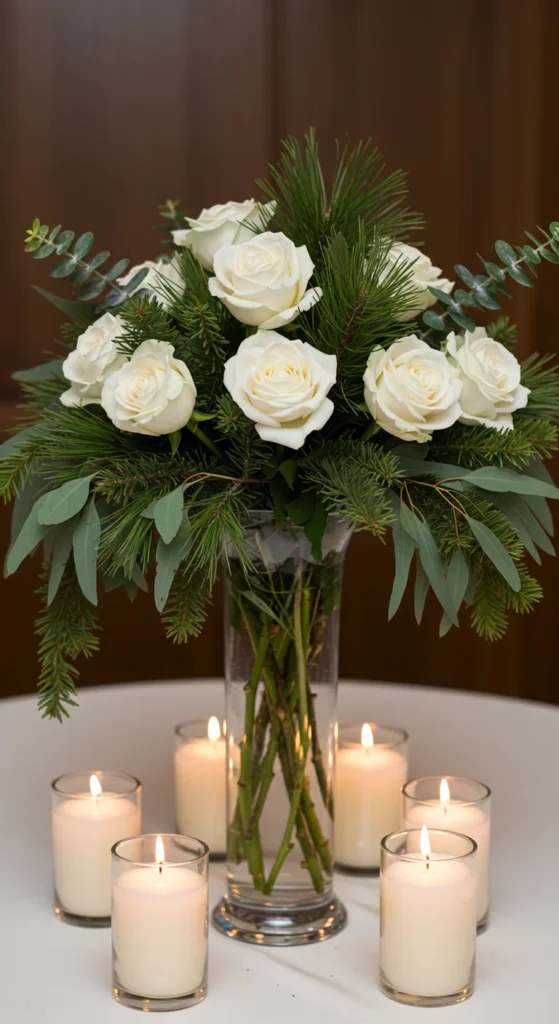 Create a simple floral centerpiece using evergreen branches, white roses, and berries. Even grocery store flowers can look stunning when arranged with care. Add a few candles beside it to tie everything together.