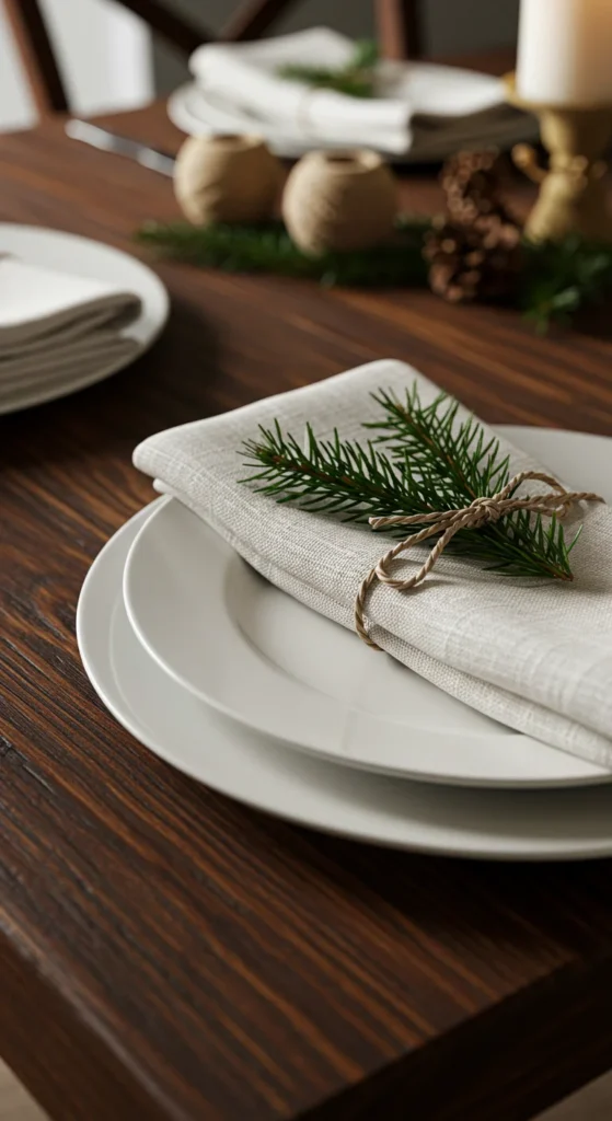 Napkins are a small detail that make a big impact. Try simple folds tied with twine or ribbon. Slip a cinnamon stick or pine sprig for a festive scent. Fabric napkins feel more refined and can be reused for years.