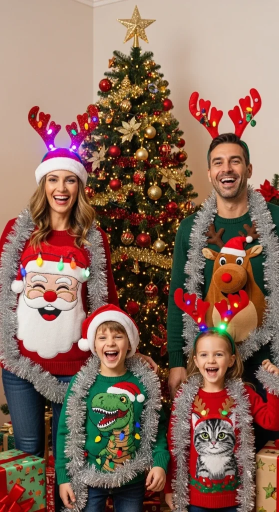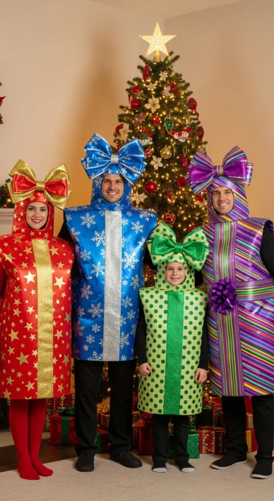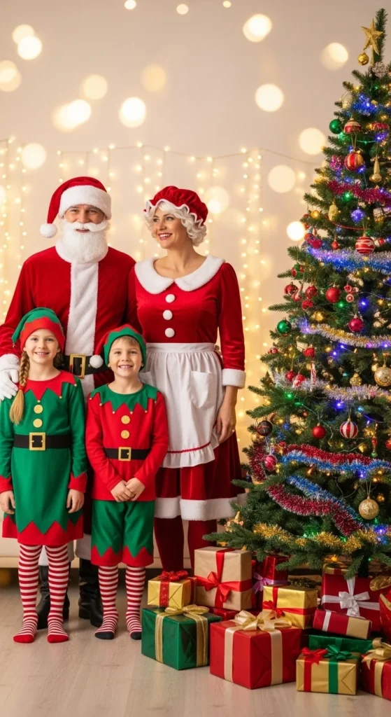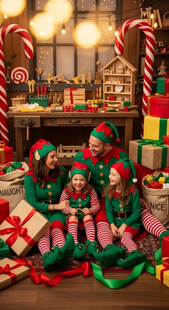Recreate Santa’s workshop vibe! Wear aprons, striped leggings, and pointy hats. Use toy hammers or wrapping paper rolls as props. It’s cheerful, colorful, and works perfectly for large families.