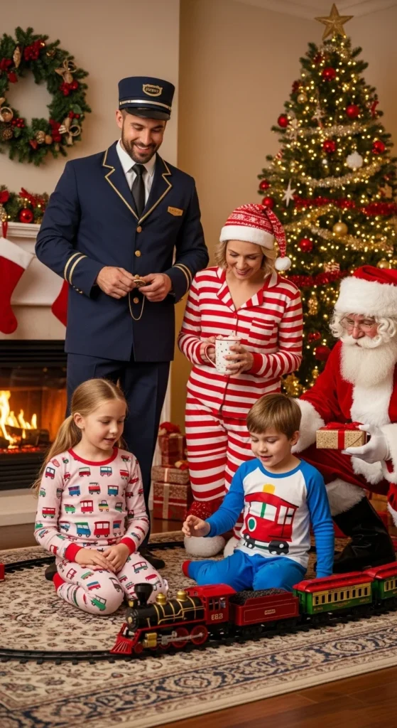 Dress like characters from The Polar Express. One parent can be the conductor, others can wear pajamas holding cocoa mugs. Use a toy train for props. It’s ideal for movie night or bedtime photos.