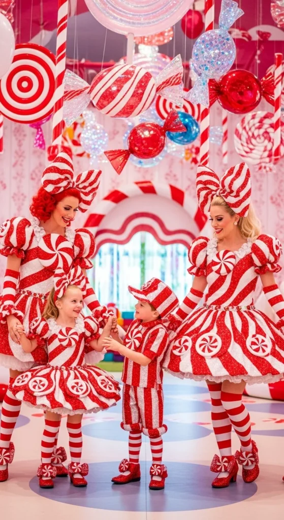 Use striped shirts and leggings for a candy cane theme. Add red ribbons and peppermint props. It’s easy to DIY and ideal for last-minute ideas. Wrap red ribbons around white clothing for a homemade version.
