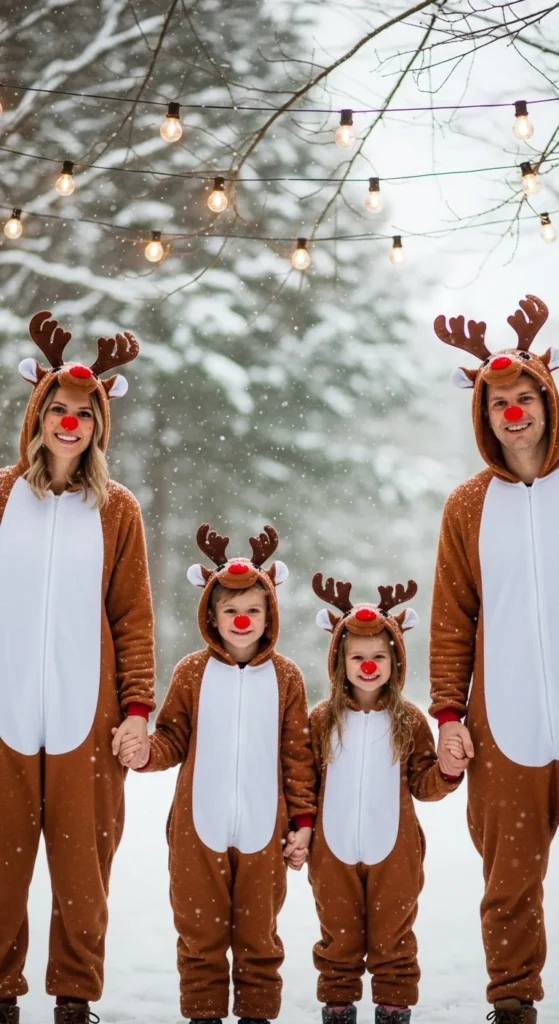 Turn your family into Santa’s reindeer squad. Brown outfits, red noses, and antler headbands make this look adorable and cozy. Use brown hoodies for a quick version. Add felt ears and tails for fun. It’s comfy enough for lounging and cute enough for Christmas Eve photos.