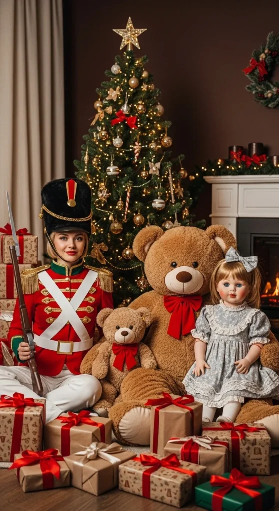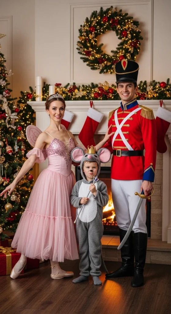Bring a bit of ballet charm home. Use red jackets, toy swords, tulle skirts, and gold trim. DIY fairy wings and crowns add magic. The Nutcracker theme brings elegance and nostalgia to your Christmas photos.