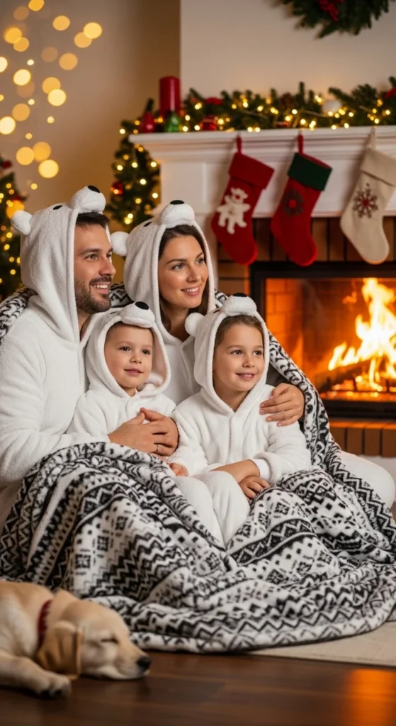 Stay cozy with polar bear onesies. White outfits, fuzzy ear headbands, and black nose makeup bring this idea to life. Ideal for indoor family time and great for photos with pets, too.