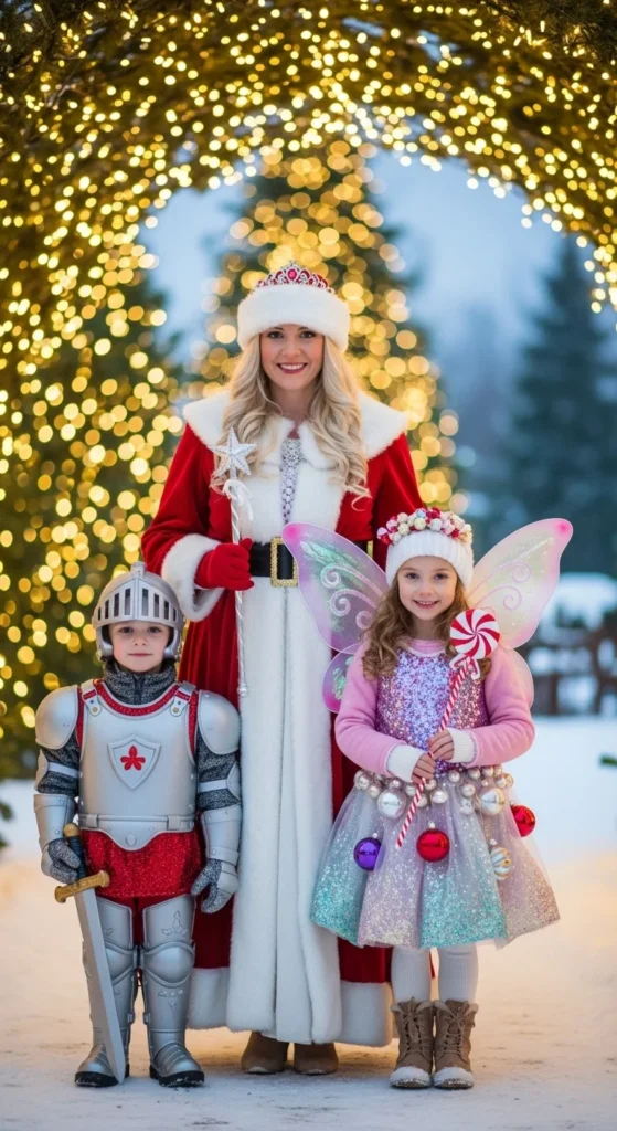 Start with the most timeless theme — Santa and his elves. One parent becomes Santa in red and white, while kids wear green elf costumes with striped leggings. Add a fake beard, felt hats, and gold buttons. You can even use red sweaters and green hoodies for a DIY touch. It’s simple, joyful, and perfect for holiday pictures.
