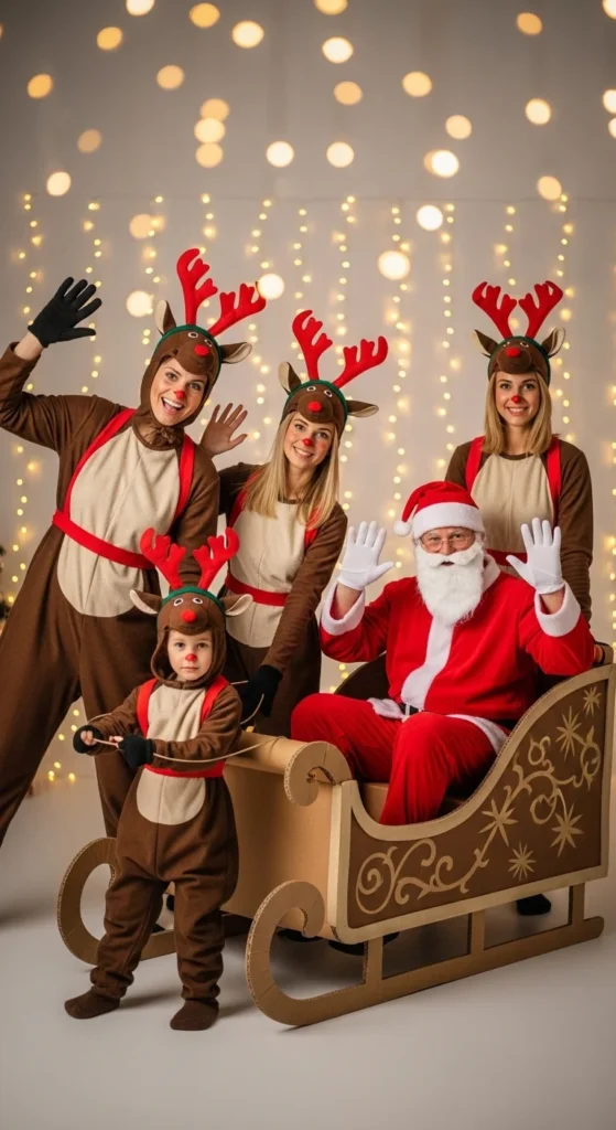 Create a fun sleigh setup! One parent can be Santa while others wear brown outfits with antlers to pull a cardboard sleigh. Add red noses for Rudolph and gold rope for “reins.” It’s playful and photogenic.
