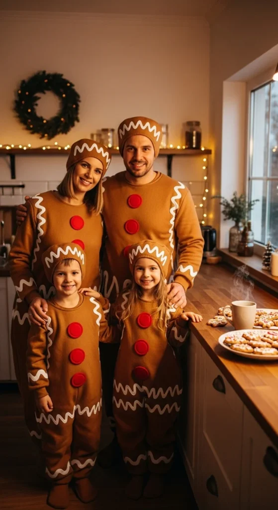 Go sweet and classic with a gingerbread family theme. Brown clothing, white puffy paint for icing, and felt candy accents bring the look together. Kids can carry cookie-shaped props for photos. It’s creative, affordable, and guaranteed to make everyone smile.