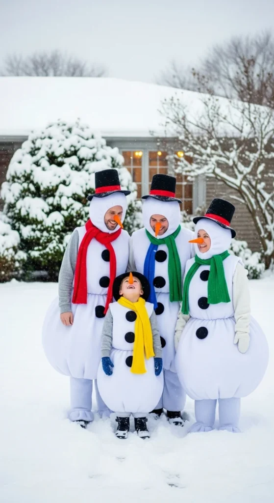 A snowman theme works for all ages. Use white sweatshirts, add black paper buttons, and orange cones for noses. Wrap colorful scarves for contrast. It’s budget-friendly and cozy for outdoor or indoor photos.