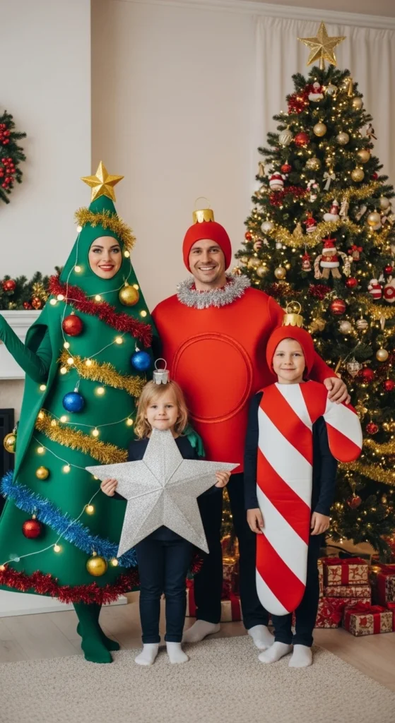 Let mom or dad be the Christmas tree while kids become ornaments. A green poncho with tinsel creates the tree look, while metallic clothes or round cardboard “balls” make perfect ornament costumes. Add star headbands for sparkle.