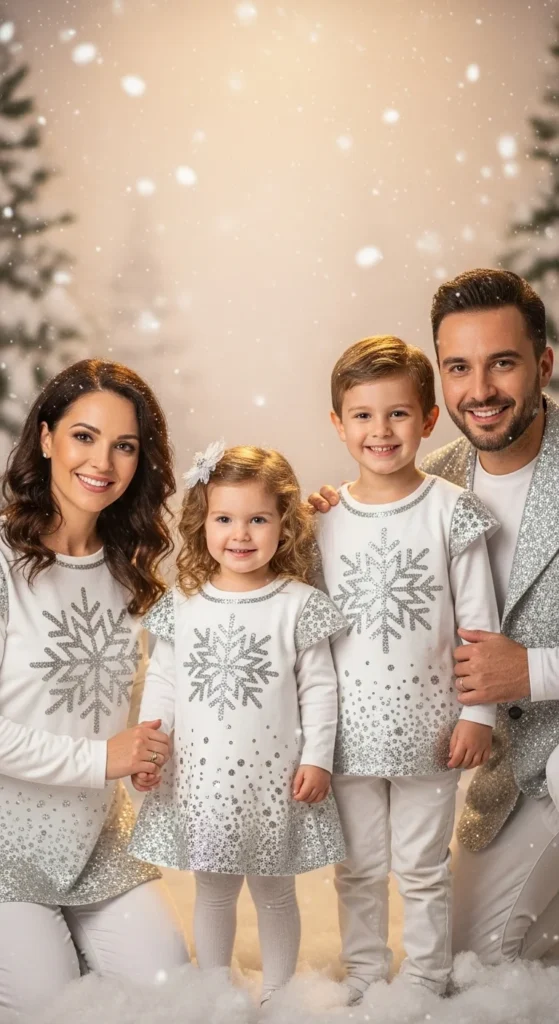 Turn your family into walking snowflakes. White clothing, silver glitter, and cutout paper snowflakes make the outfit shine. Add silver scarves for shimmer. It’s a beautiful theme for indoor portraits.
