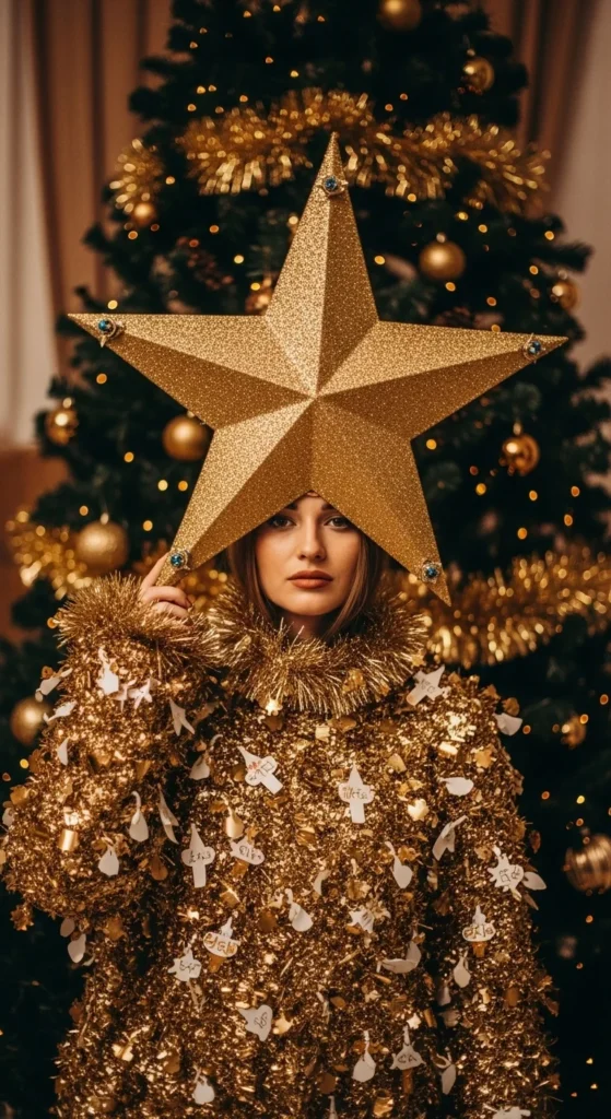 Create a costume entirely from recycled decorations. Use broken ornaments, old tinsel, and leftover wrapping ribbon. Hot glue them onto a vest or jacket. It’s sustainable and gets bonus laughs for creativity. Great conversation starter too.
