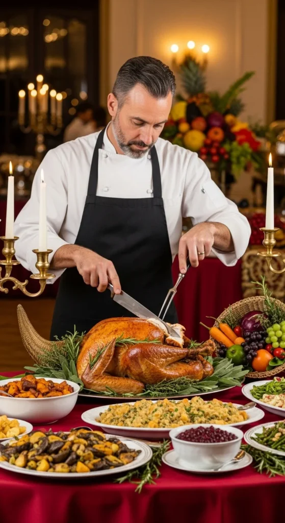 Set up a carving station with roast turkey, beef, or lamb. Offer sauces like cranberry, peppercorn, and garlic butter. Keep it warm with a chafing dish. Add rosemary sprigs for aroma and style.
