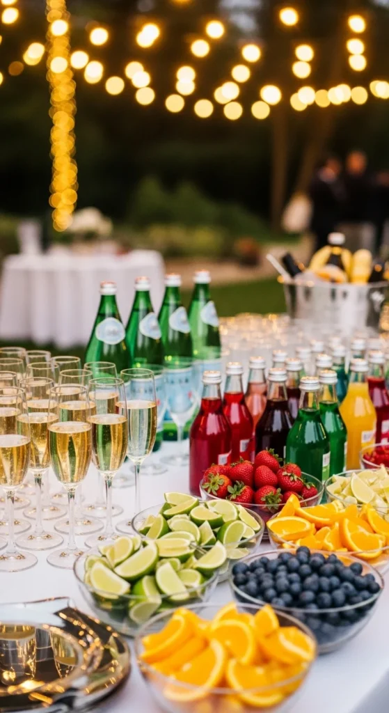 Set up a drink bar with mocktails and bubbly. Include mixers, garnishes, and fruit slices. Add festive tags for each flavor to keep it organized.