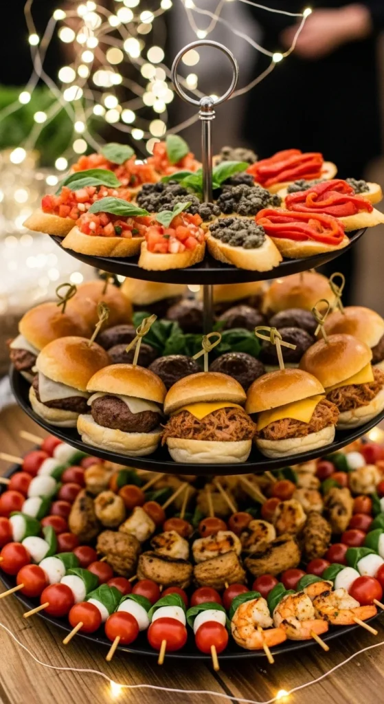 Create mini appetizer towers using tiered stands. Serve sliders, bruschetta, or shrimp skewers. These bite-sized treats look festive and keep guests mingling with ease.
