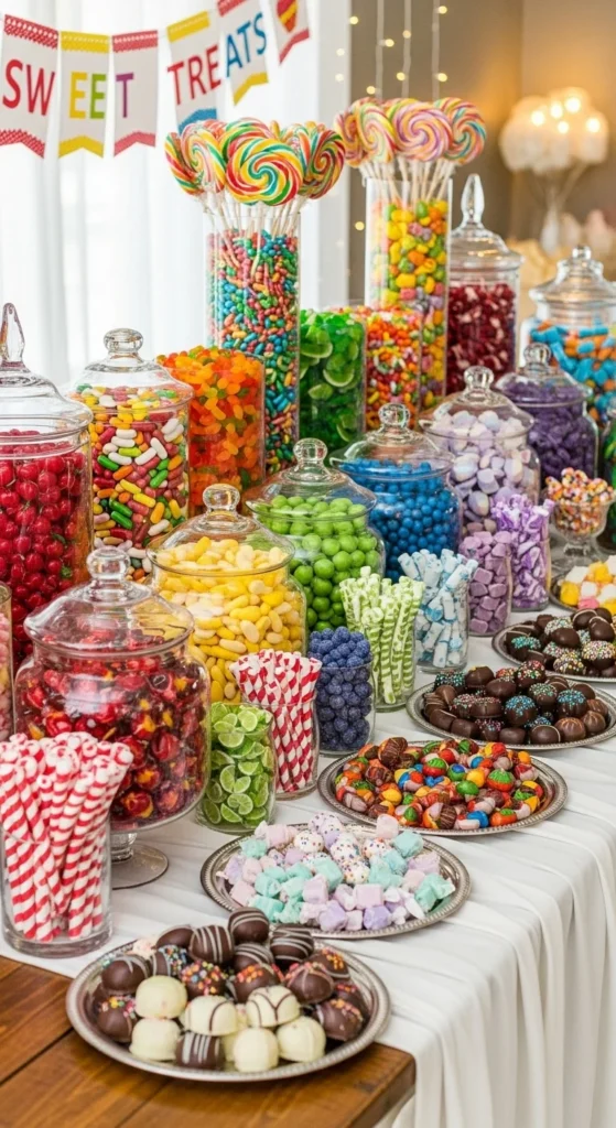 End the night sweetly with a candy buffet. Use clear jars filled with chocolates, candy canes, and gummies. Let guests fill their own treat bags.