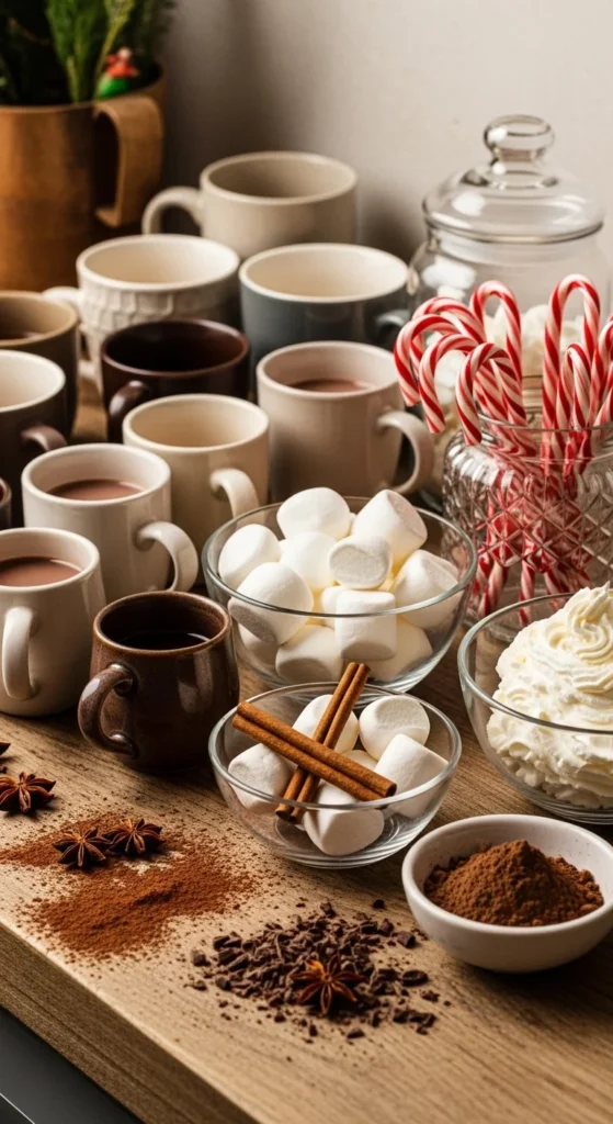 A hot chocolate bar warms the night. Offer toppings like mini marshmallows, whipped cream, caramel drizzle, and peppermint sticks. Use cute mugs for charm.