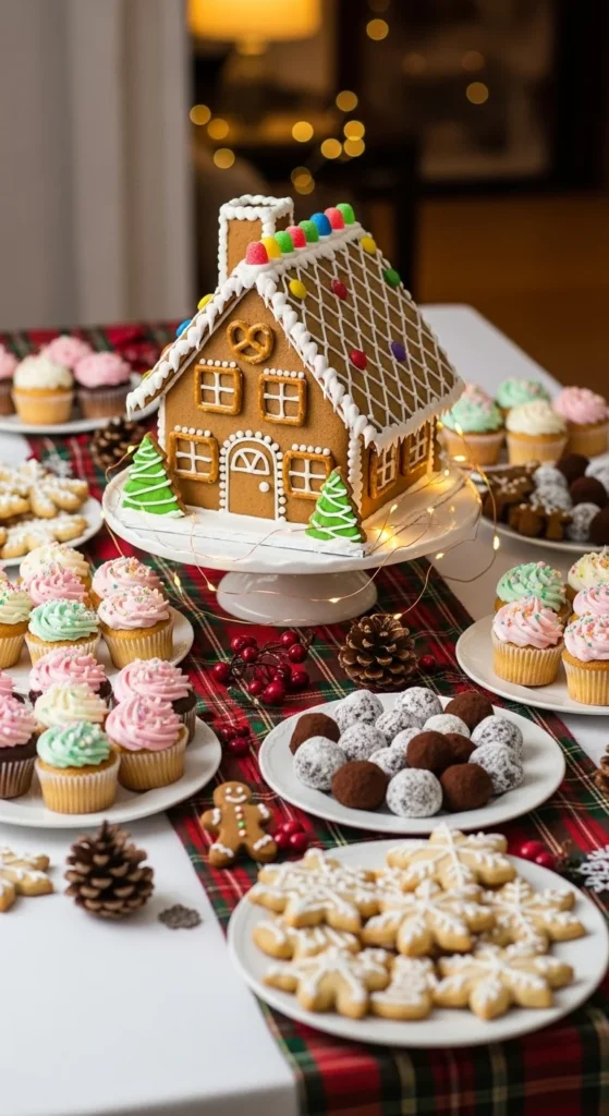 Turn dessert into décor. Arrange cupcakes, cookies, and truffles on different levels. A gingerbread house adds the perfect centerpiece for your dessert wonderland.