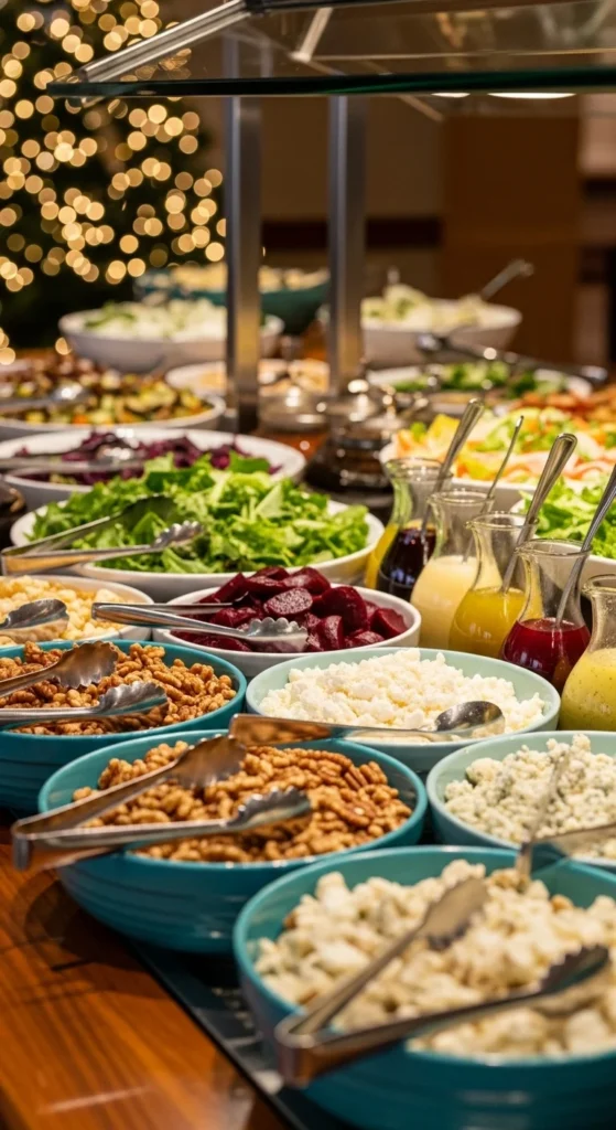 Offer healthy variety with a winter salad station. Include roasted veggies, candied pecans, and dried cranberries. Drizzle with balsamic or honey mustard dressing.