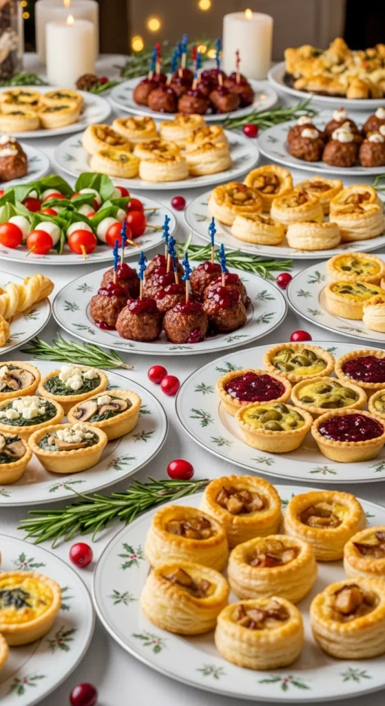 Finger foods keep guests chatting. Serve skewers, puff pastries, and meatballs. Arrange on holiday-themed trays for an easy-to-grab feast.