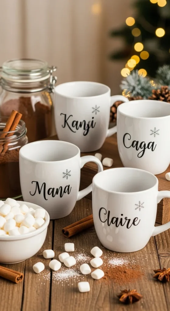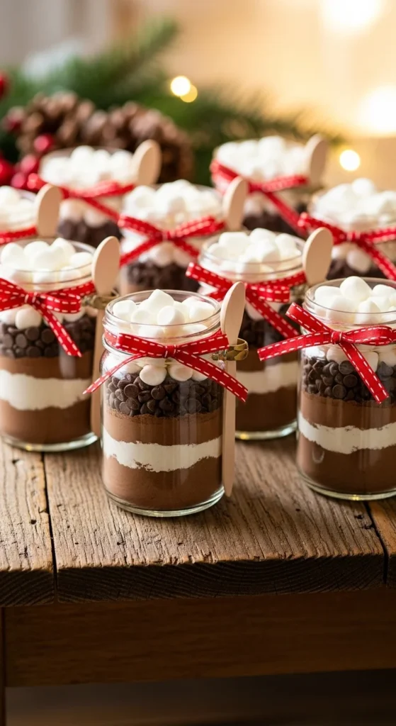Mini hot cocoa jars are always a hit because they’re both cute and practical. Just layer cocoa mix, sugar, and marshmallows in small mason jars. Add a festive tag with directions and a ribbon on top. You can even personalize each jar with a guest’s name.
