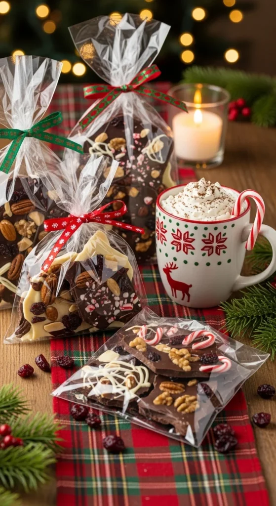 Chocolate bark is festive and delicious. Melt chocolate, add nuts or candy canes, and let it set before breaking it into pieces.