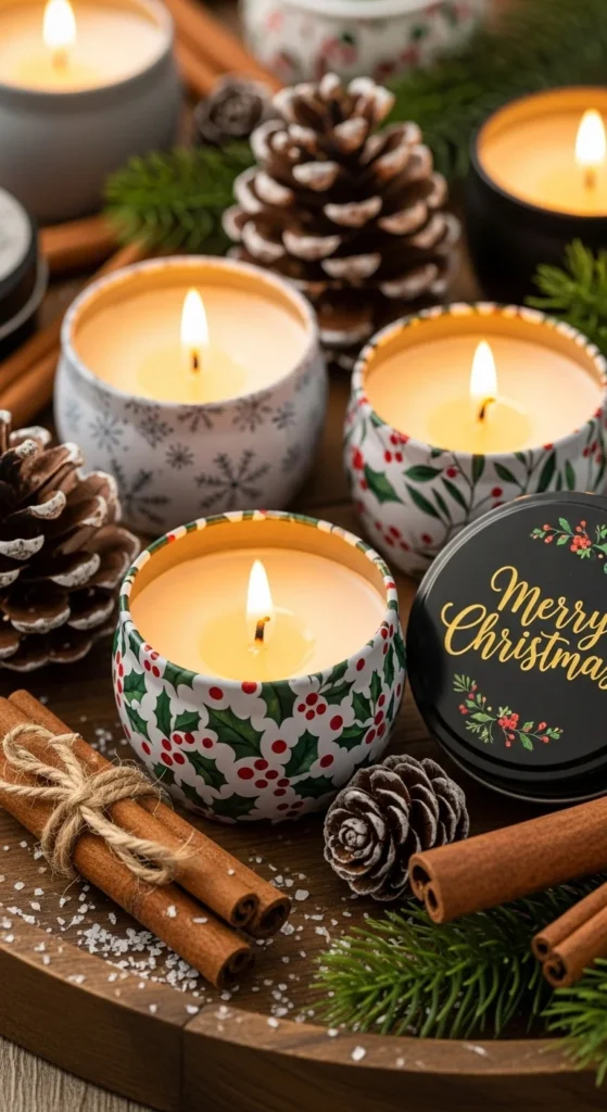 Candle tins are timeless and easy to customize. Choose seasonal scents like cinnamon, pine, or vanilla, and pour them into small metal tins. Add a cute label with your party date or a short quote like “Merry & Bright.”