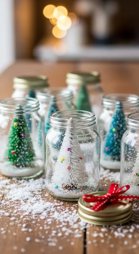 Create tiny snow globes using jars, glitter, and water. Add a small figurine inside and seal the lid tightly.