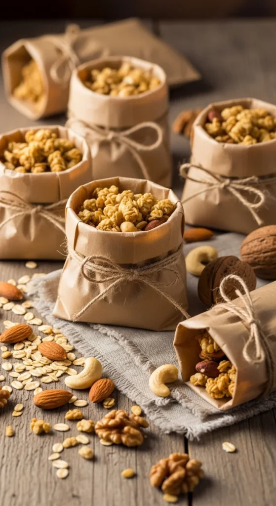Homemade granola is both healthy and tasty. Bake oats, honey, and nuts until golden and pack in paper pouches.