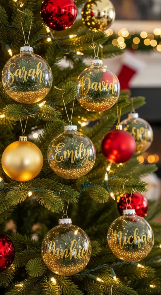 A personalized ornament makes a heartfelt keepsake. Use clear baubles and fill them with glitter, small photos, or fake snow. Write each guest’s name on the ornament using gold paint pens.