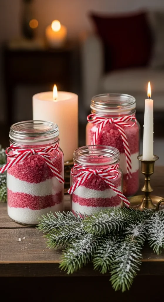 DIY bath salts are relaxing and inexpensive. Mix Epsom salt with a few drops of peppermint essential oil and red coloring for a candy cane look.