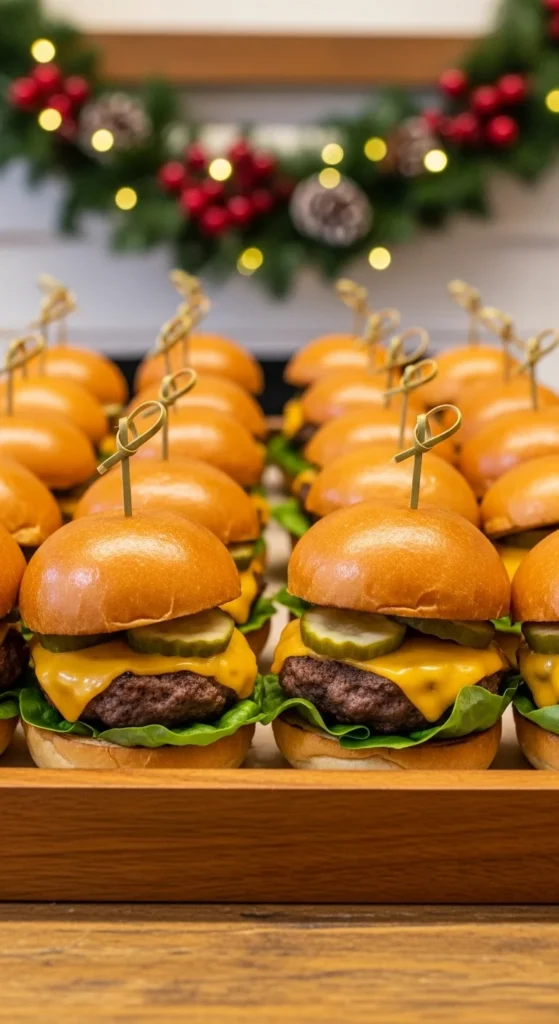 Use mini buns and pre-cooked patties. Add cheese, lettuce, and sauce. Wrap in foil to keep warm. Try pulled turkey or BBQ chicken for variety.