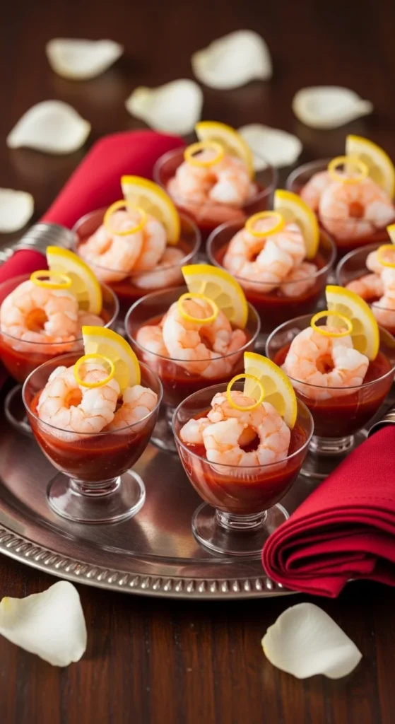 Serve shrimp in individual cups with cocktail sauce and lemon wedges. They look elegant and make serving easy. Keep them chilled until guests arrive.