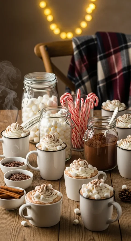 Set up a self-serve hot chocolate bar with toppings like whipped cream, marshmallows, and crushed peppermint. Use cute mugs and holiday napkins for a festive touch.