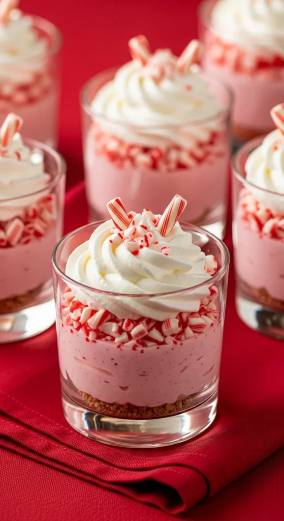 Layer crushed candy canes, vanilla pudding, and whipped cream. Use clear cups to show off the stripes. They’re cute, simple, and festive for any dessert table.