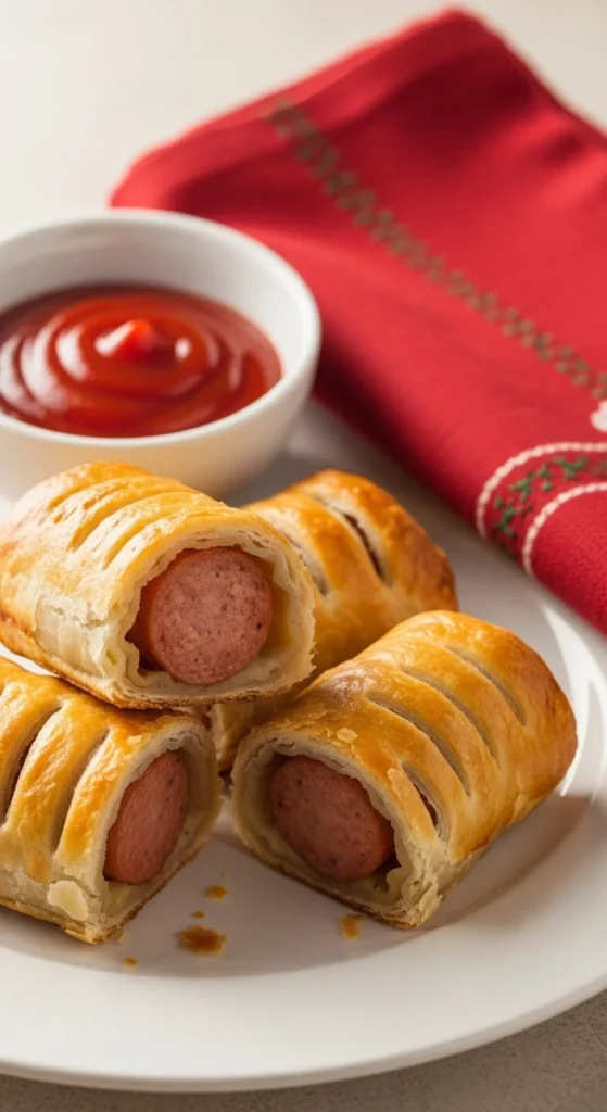 Use puff pastry and sausage filling for quick, tasty snacks. Slice into small portions before baking. Serve with mustard or ketchup.