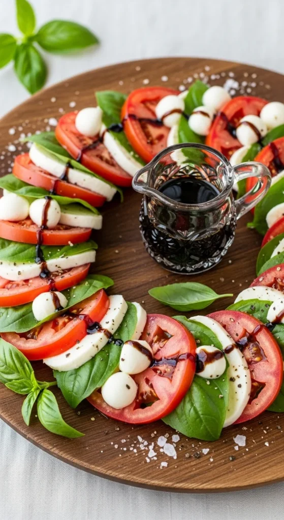 Arrange mozzarella, tomatoes, and basil in a wreath shape. Drizzle olive oil and balsamic glaze, and add a bow for decoration. Simple yet beautiful.