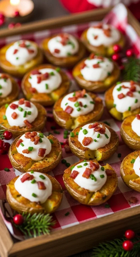 Bake baby potatoes, scoop the centers, and fill with sour cream, cheese, and bacon. Sprinkle chives on top. They’re hearty, fun, and satisfying.