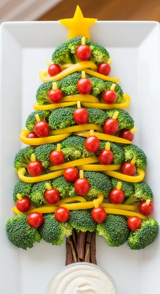 Shape broccoli florets like a Christmas tree, use cherry tomatoes as ornaments, and yellow peppers for a star. Add a small bowl of ranch at the bottom as the “trunk.” Healthy, colorful, and crowd-friendly.