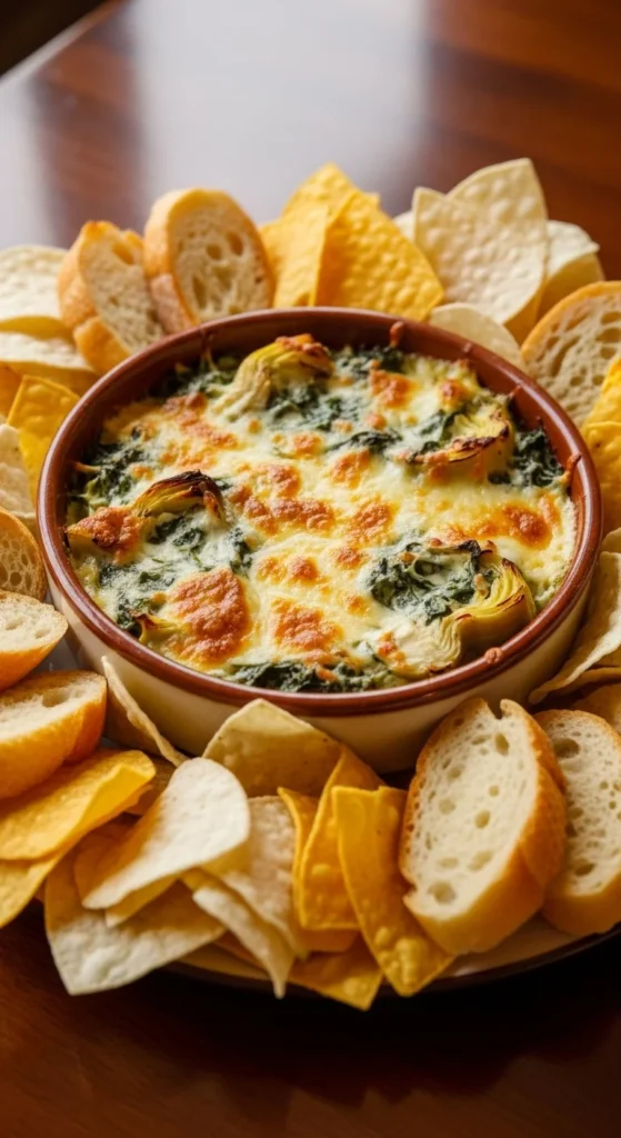 Combine spinach, cream cheese, artichokes, and mozzarella. Bake until golden. Serve with crackers or toasted baguette slices. Make it ahead and reheat for convenience.